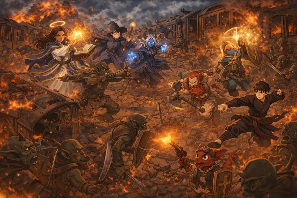 Down by the well, Donnie raised his hands, arcane sigils dancing in the air. “Let's thin the ranks,” he muttered, loosing a barrage of glowing darts. The magic missiles whirled like hummingbirds, each one striking true. One hit a goblin rifleman, another tore through the shoulder of a runner, and the last burst against the chest of a berserker mid-charge. He stumbled—only for Ryn to step forward, hand aglow with flame.