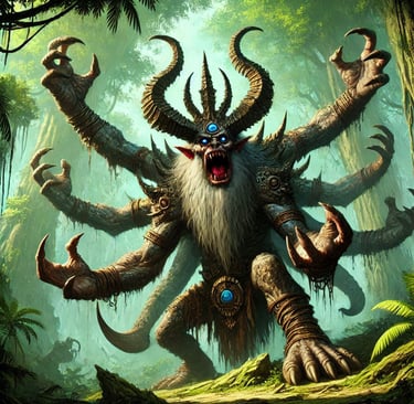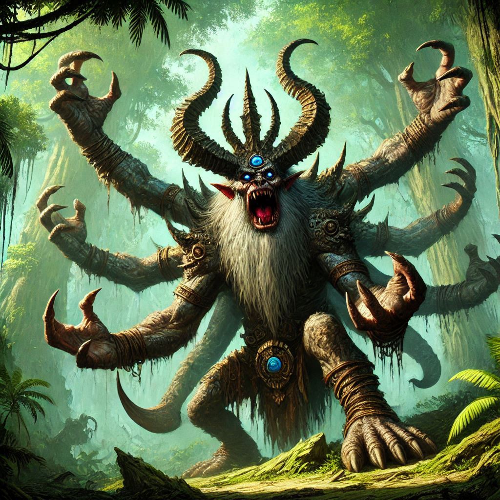 As the Syndicate tracked the creature responsible for the claw marks, they found themselves deep in the jungle's heart. Suddenly, a deafening roar echoed through the trees, and a massive seven-armed troll burst from the foliage. Its eyes glowed with a malevolent intelligence, and its sheer size and strength were intimidating.