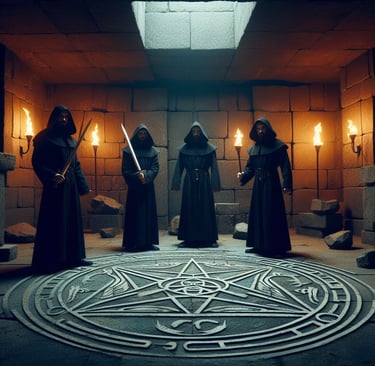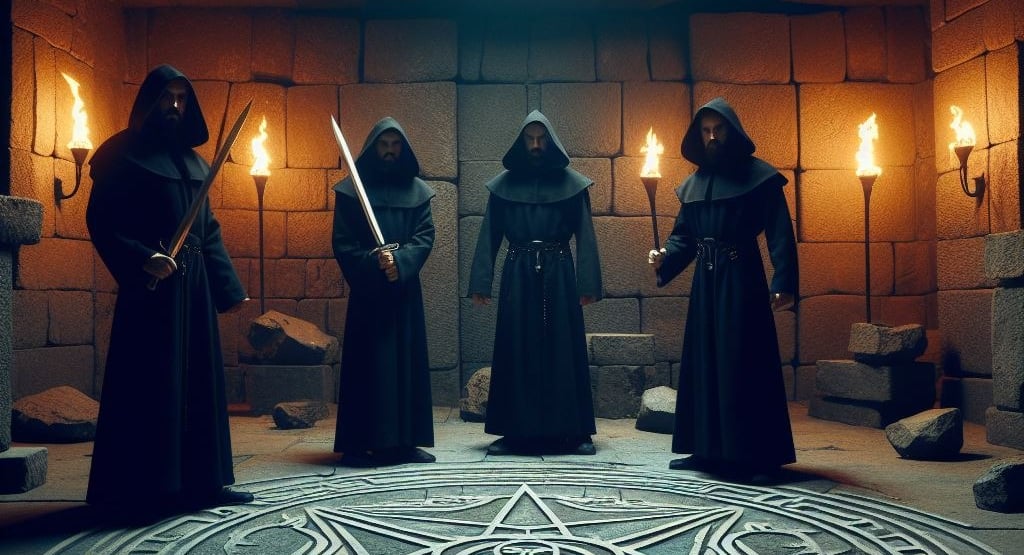 It was then that Shadow found a secret door. He asked Blueterion to open the door and she tried to give shove to open but it would not budge. She stepped back punch the door as hard as she could. The door shattered and inside Shadow found a treasure chest. The group moved on through the tunnels and came across some cultists in black robes. A fight ensued but Blueterion and Aust quickly dispatched with three of the four cultists. One cultist was running away so Shadow through a dart but he threw it too hard and sailed past its intended target and struck something metal in the other room.