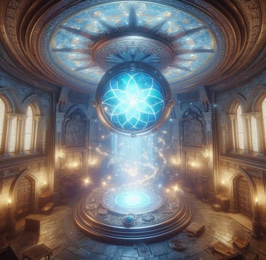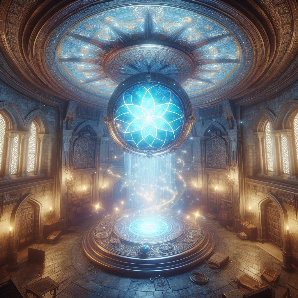 The group followed the wizards deeper into the arcane maze. At last, they reached the Core Chamber—a cylindrical vault of copper and glowing crystal, filled with levers, sigils, and rotating arcane rings. In its center floated the Zelladium Crystal, suspended by chains of starlight.